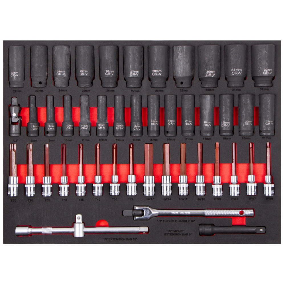 Rázové hlavice a sada nástrčných klíčů v pěnové výplni. Sada 45 ks. 25 kovaných hlavic 8 - 32 mm, 16 nástrčných klíčů Torx T27–T70, imbus HW6–HW17. Prodlužovací nástavec, adaptér, ohebná rukojeť.