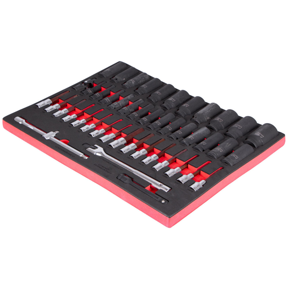 Sada hlubokých rázových hlavic, bitů a příslušenství 1/2" v praktické pěnové výplni, ideální pro náročné montážní a servisní aplikace.